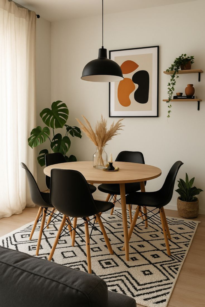 Côté style, privilégiez un motif géométrique pour une ambiance contemporaine, ou un kilim aux teintes naturelles pour une atmosphère plus bohème. L’essentiel est que le tapis dialogue avec celui du salon, soit par des couleurs communes, soit par un style similaire. Cette astuce ancre physiquement et visuellement l’espace repas tout en ajoutant une couche de confort acoustique appréciable.