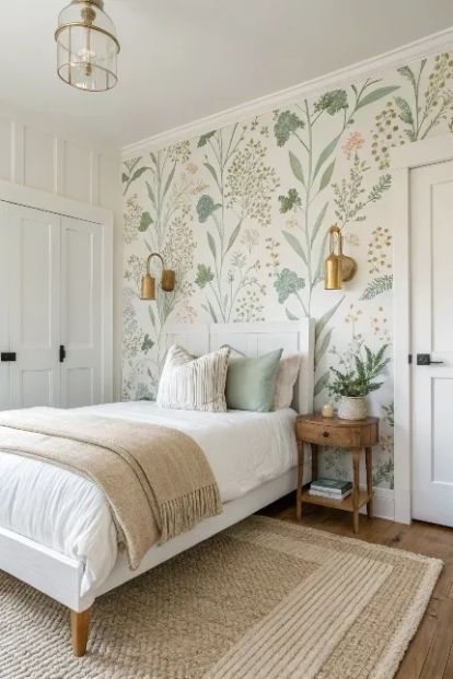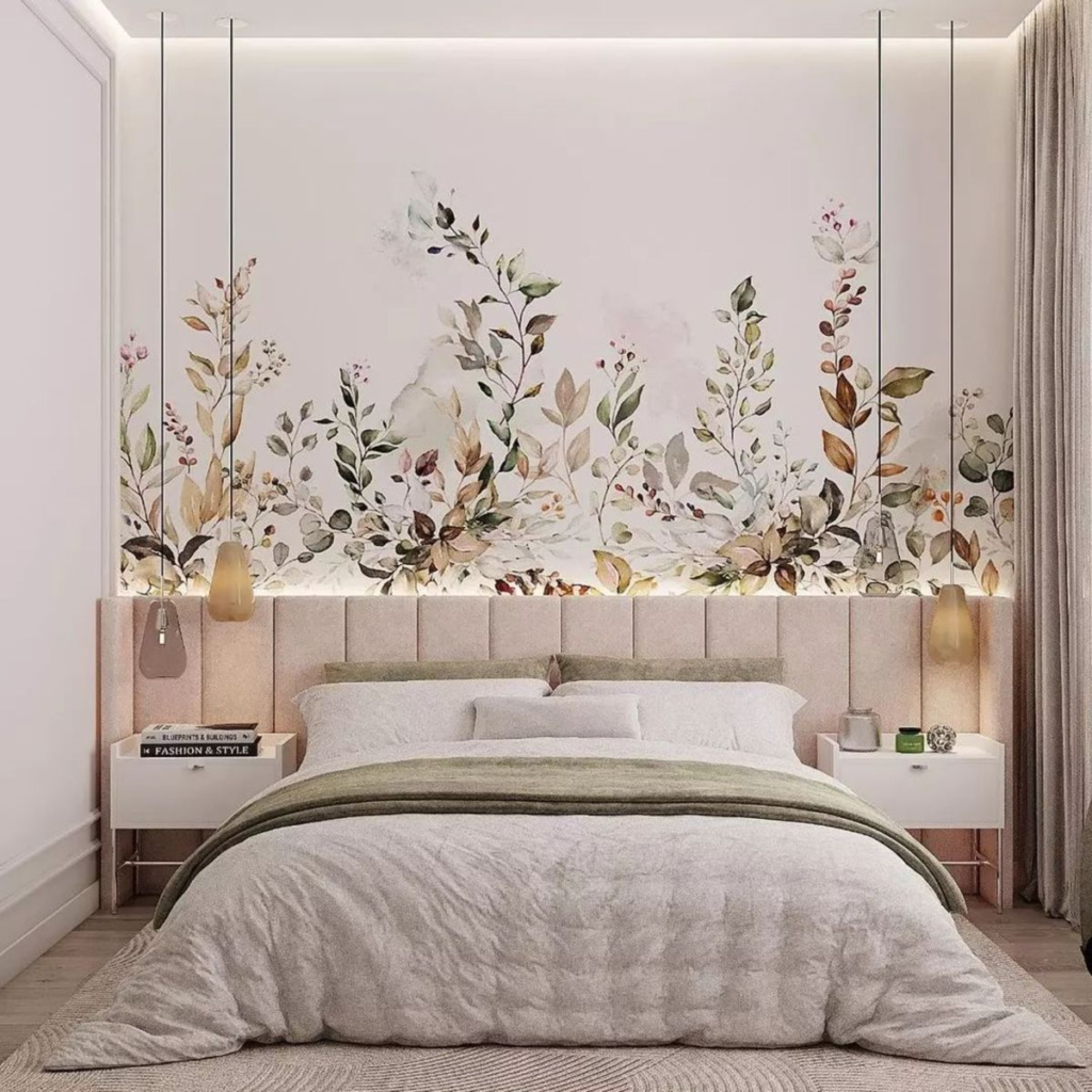 Le papier peint chambre adulte romantique évoque la douceur, la poésie et l’intimité. Pensez aquarelles délicates, motifs floraux pastel, oiseaux gracieux ou branches de cerisiers japonais. Les teintes poudrées (rose blush, mauve tendre, beige rosé) créent une atmosphère apaisante et féminine sans tomber dans le cliché. Ce style se marie parfaitement avec du linge de lit en lin blanc, des matériaux naturels et des touches dorées. Idéal pour créer un sanctuaire romantique où se ressourcer après une journée chargée.