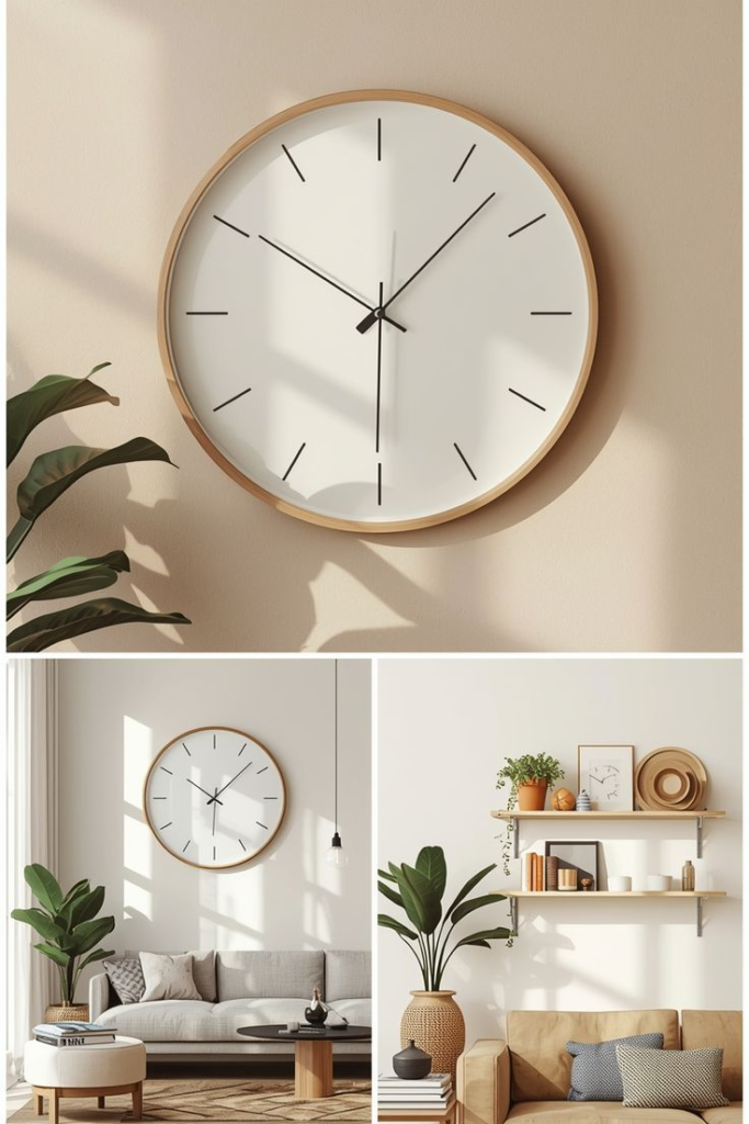 ALT text suggéré : grande horloge murale minimaliste salon blanc épuré
