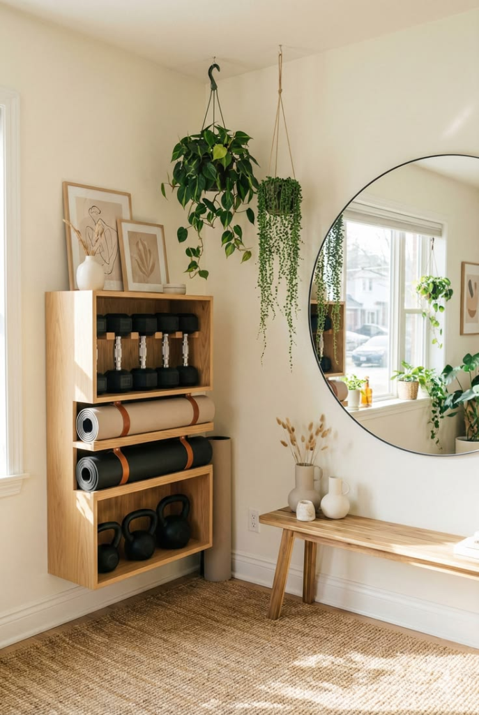 La solution pour ceux qui manquent de place. Un tapis de yoga roulé dans un coin, des petits haltères design posés sur une étagère. L’idée est d’intégrer le sport à la décoration sans que cela ne prenne le dessus.